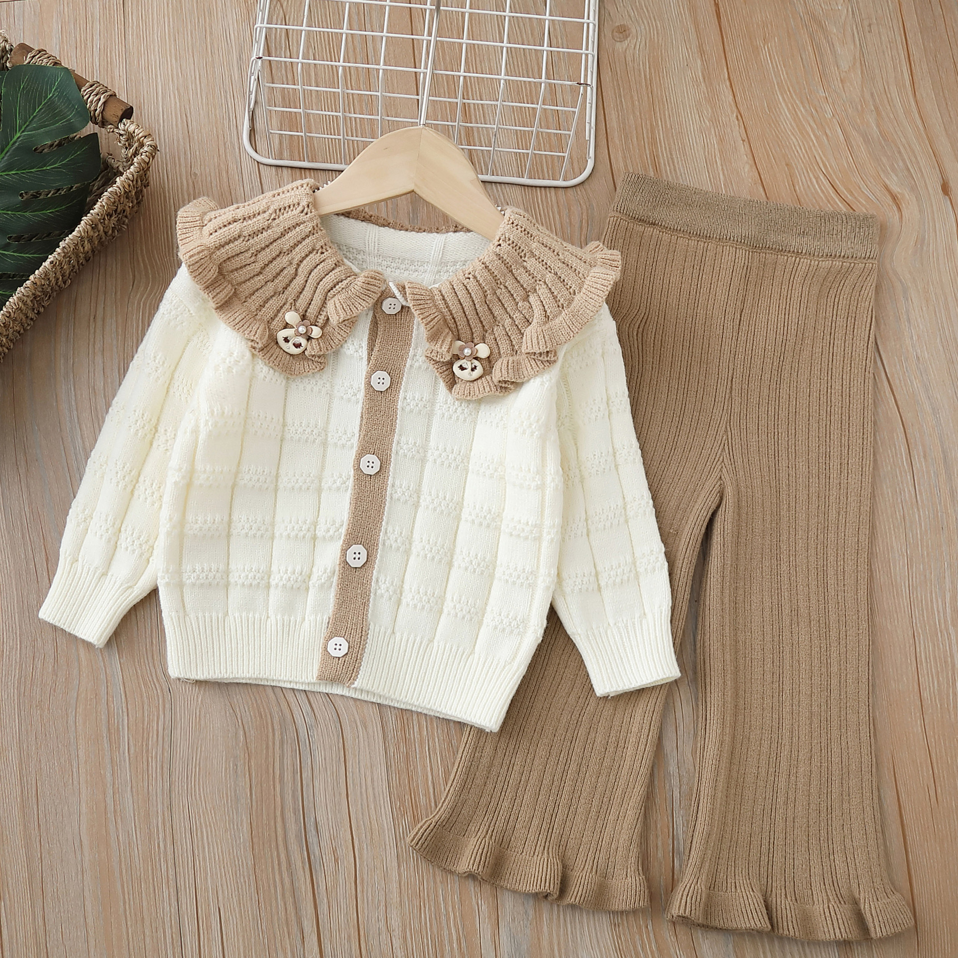 2024 Girls' Sweater Two Piece Set Knitted Jacket Autumn/Winter New Collection Handmade Flower Little Girls' Big Collar Cardigan Yarn