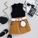 Anzugstil für Mädchen, Sommer-Outfits für Kinder, trendiger Pullover mit einfarbigen Streifen, Tanktop, Gürteltasche und kurzes Rockset