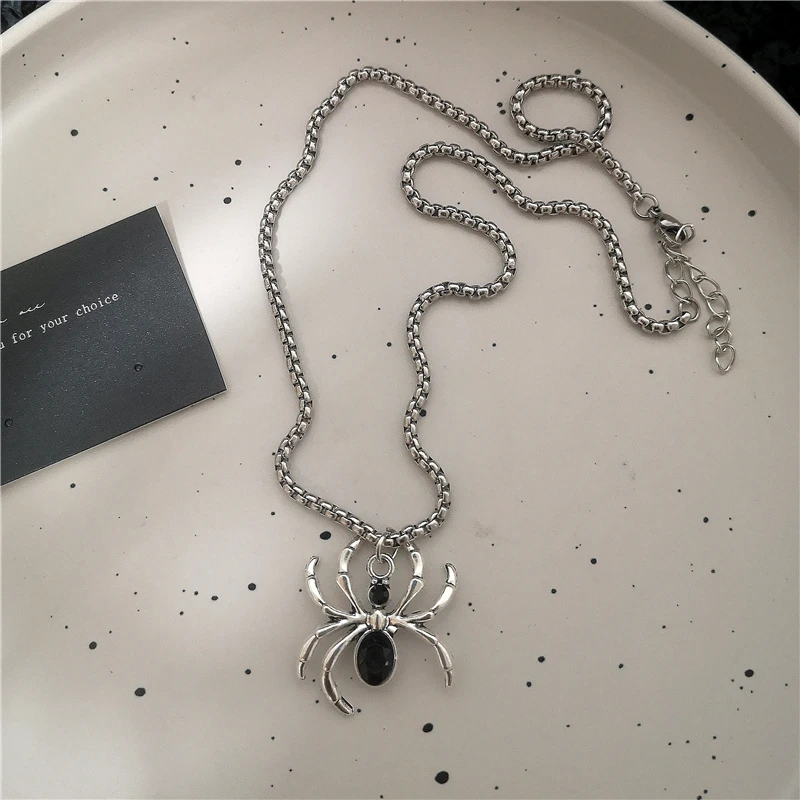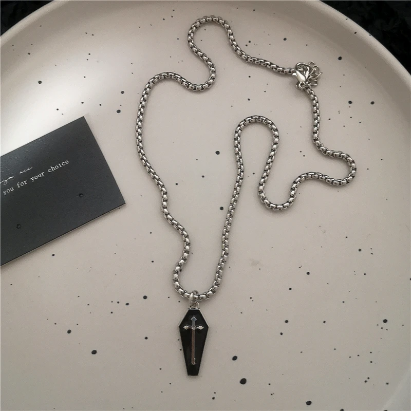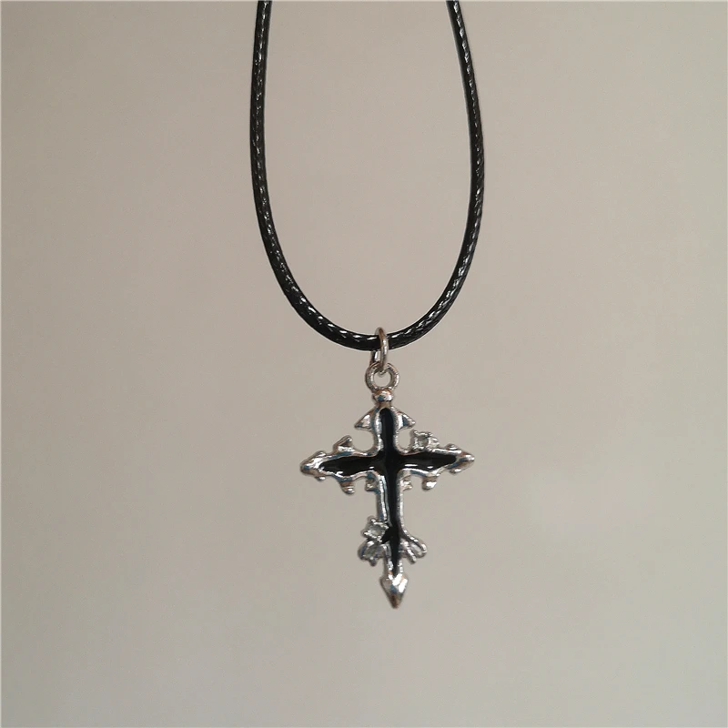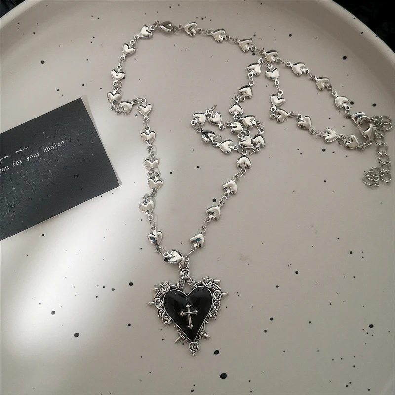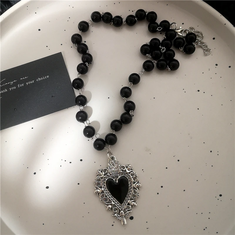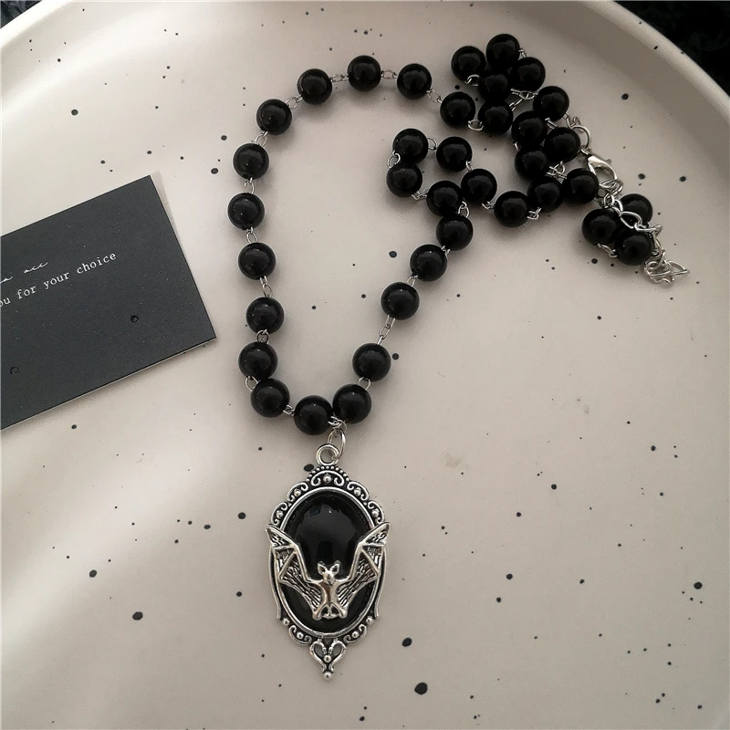 Gothic Fledermauskreuz-Anhänger mit dunklem Dornenherz und schwarzer Perlenkette, personalisierter Y2K-Halloween-Charm, Grunge-Schmuckgeschenk