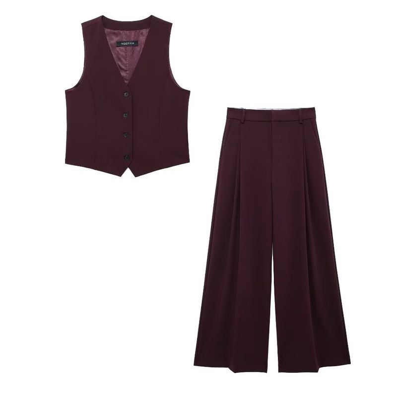 GraceChic Zweiteiler mit drapiertem, figurschmeichelndem Design, burgunderfarbenem, hochtailliertem Oberteil mit doppelten Falten und weiter Hose, Damen, Frühling/Herbst