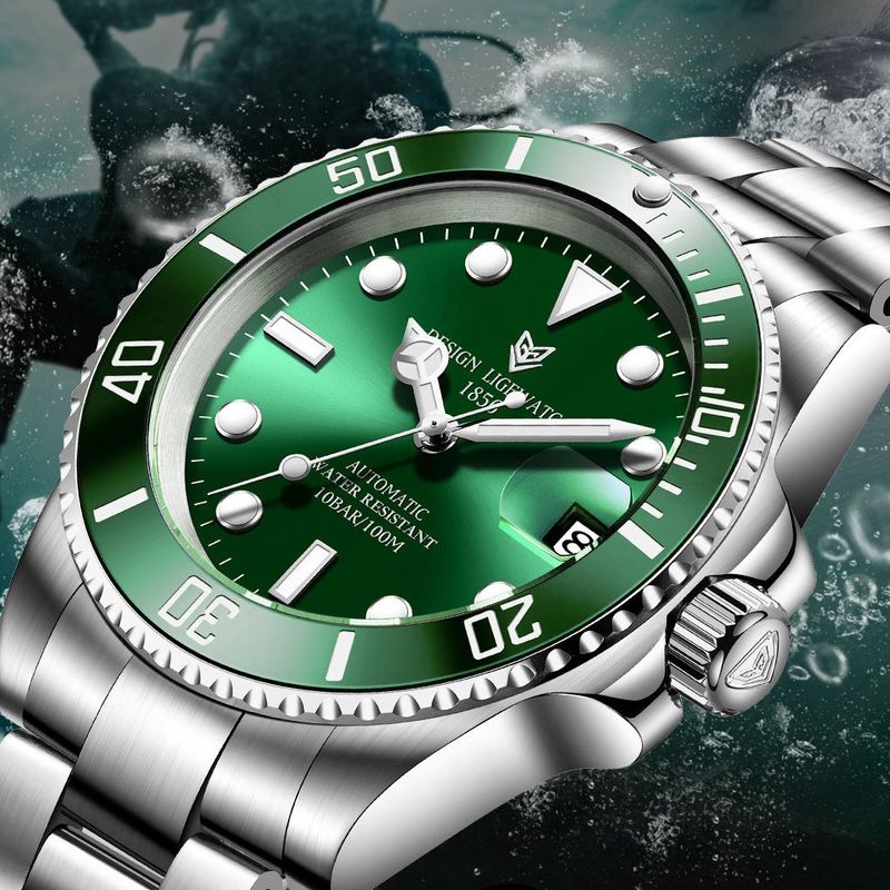 Green Water Monster Herrenuhr mit ausgehöhltem, vollautomatischem mechanischem Business-Armband aus Stahl