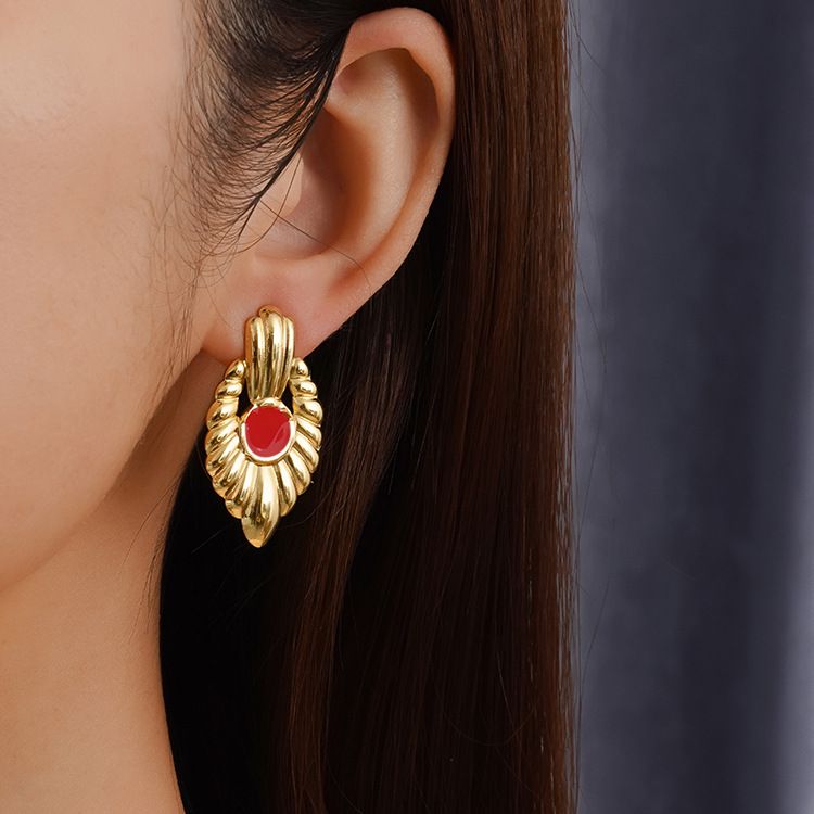 Grenzüberschreitende französische Retro-Mode, geometrischer Edelstahl, High-End-Design, goldfarbene, faltige, bunte Glasur-Ohrstecker