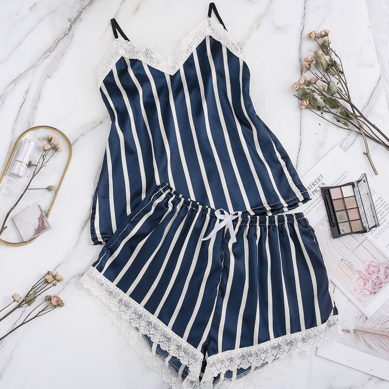Large lace transparent sexy seductive women's striped pajama two-piece set