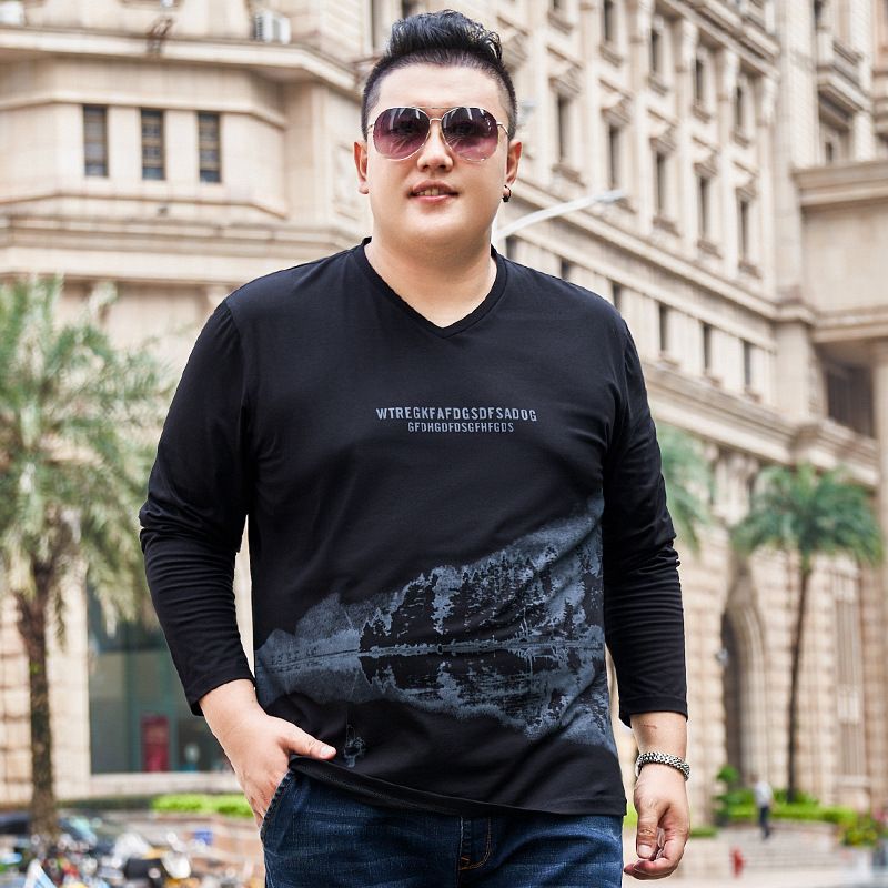 Großes Herren-T-Shirt mit chinesischem Landschaftsdruck für Frühling und Herbst, lockeres, elastisches Langarm-T-Shirt mit V-Ausschnitt und Unterhemd für Herren