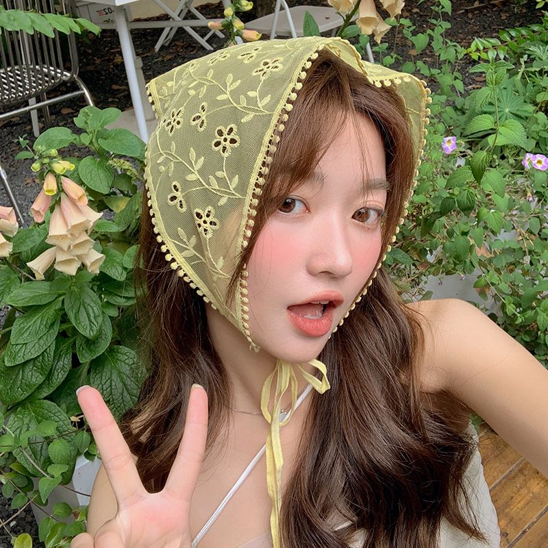 Headscarf, women's bag, hair covering headband, silk scarf, hollowed out flower hook flower triangle scarf, summer thin, breathable travel headband