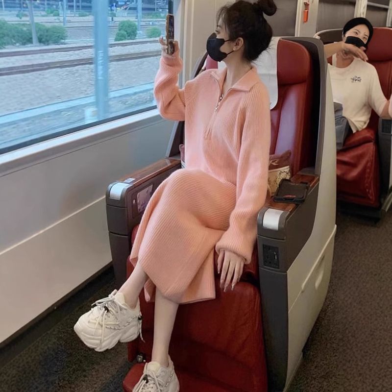Herbst Winter Neue Frauen 2025 Zipper Design Französisch Stil Schwarz Mid-Länge Basis Gestrickte Pullover Kleid