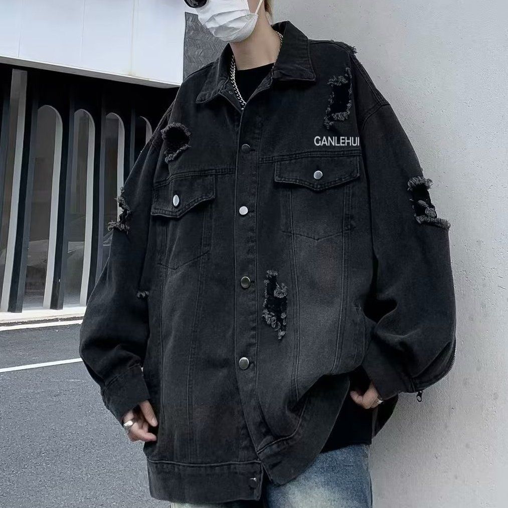Explosive Street, Broken Hole, Cowboy Jacket, Men's Spring and Autumn American Loose Top, Trendy Brand, Old and Handsome Workwear Coat