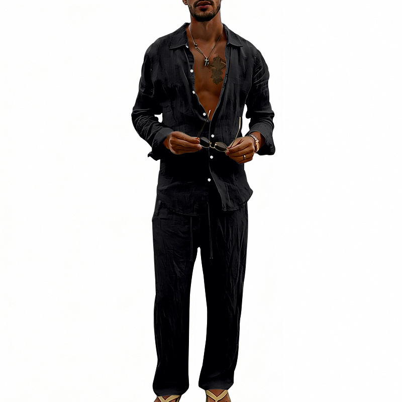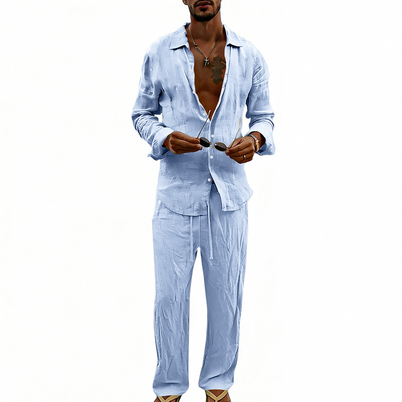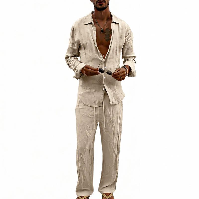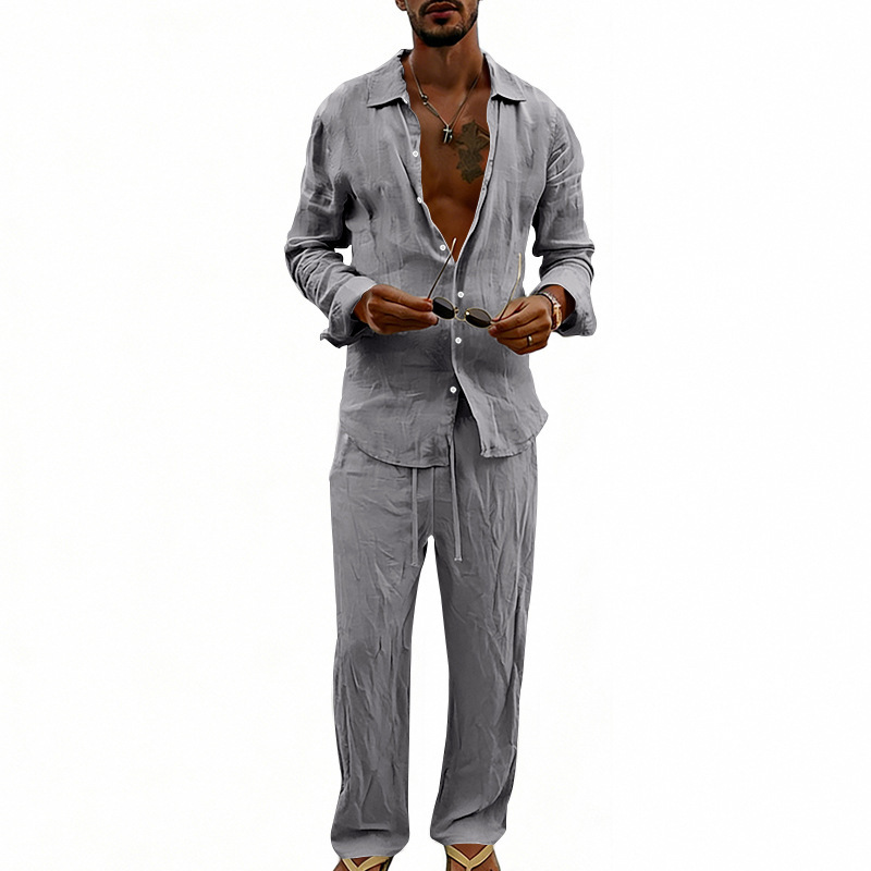 Unabhängige Website Herren-Freizeitanzug im amerikanischen Stil, locker sitzend, atmungsaktiv, aus Leinen, langärmeliges Hemd und gerade geschnittene Hose, für alle Jahreszeiten