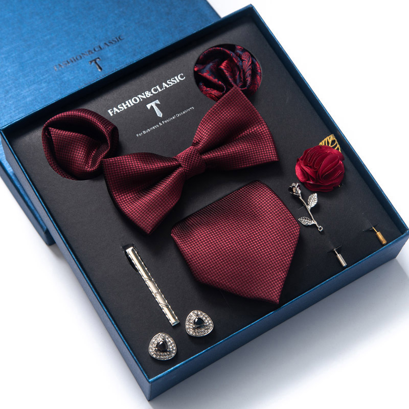 The set includes 1 tie, 1 bow tie, 2 square scarves, 1 pair of cufflinks, 1 tie clip, 2 brooches, and a blue gift box