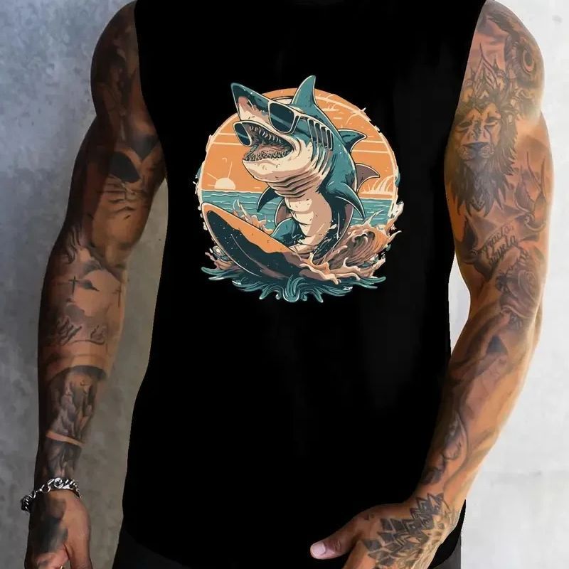 Herrenweste im neuen chinesischen Stil, niedlicher Hai, Rundhalsausschnitt, T-Shirt mit 3D-Druck, modische ärmellose Kleidung