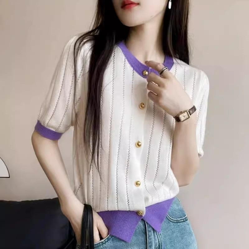 High end small fragrance style contrasting short sleeved knitted outer layer, 2024 spring and summer hollow round neck metal buckle color blocked cardigan