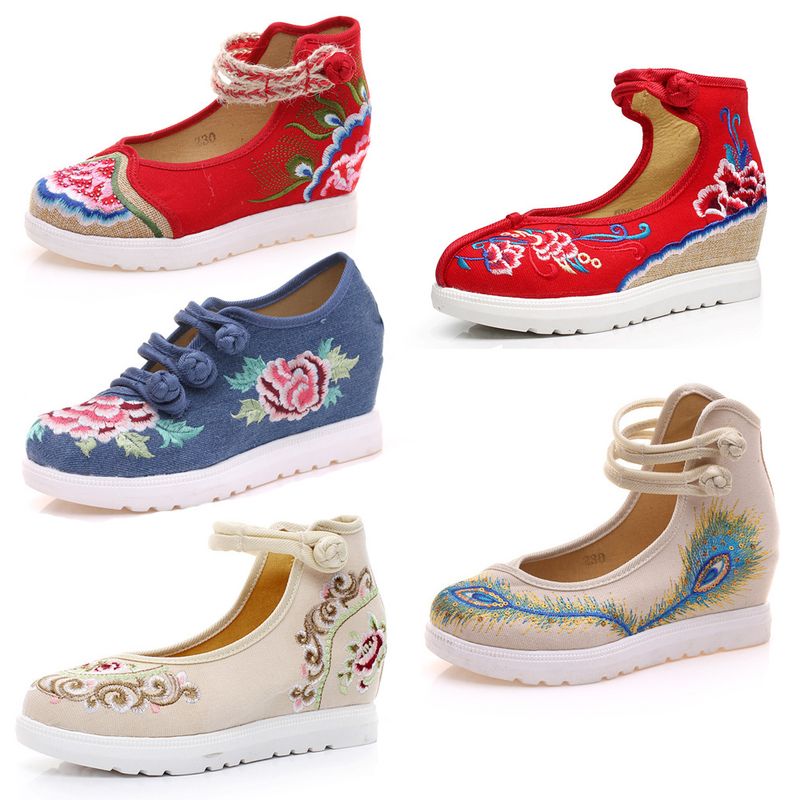 High heeled women's shoes with high heels and women's single shoes for spring and autumn, with a large white sole and raised sloping heels on canvas embroidered fabric