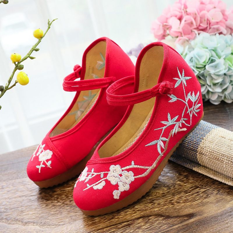 High heels, single shoes, Hanfu shoes, sloping heels, canvas embroidered cloth shoes, tea art women's shoes, spring and summer