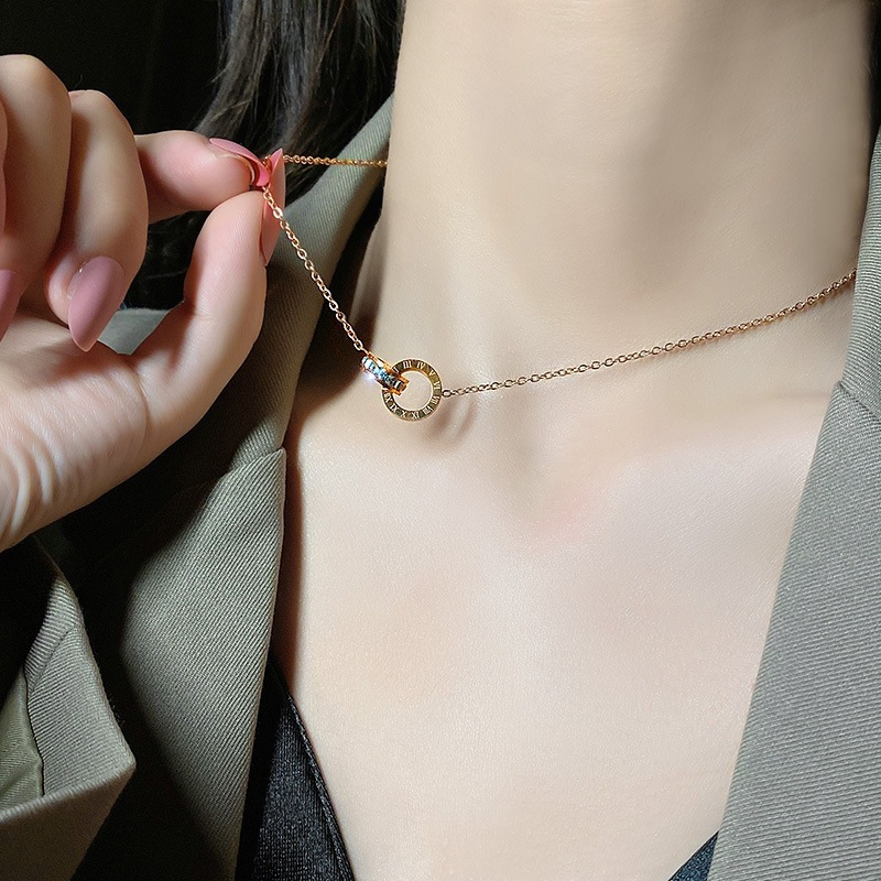 Japanische und koreanische minimalistische Doppelring-Halskette mit römischen Ziffern für Damen, neuer Roségold-Titanstahl, lichtecht