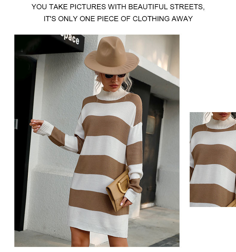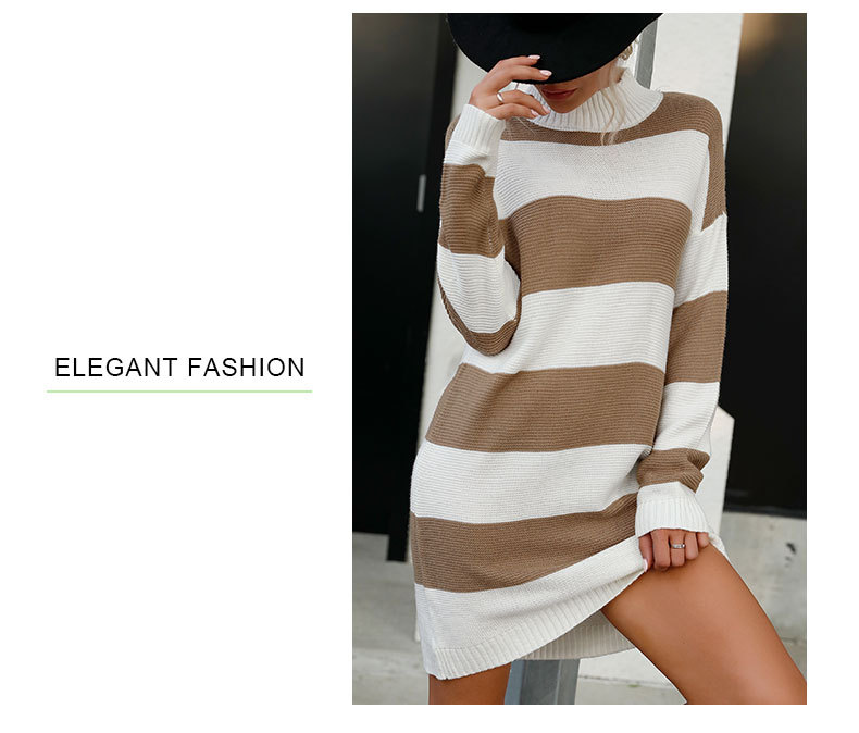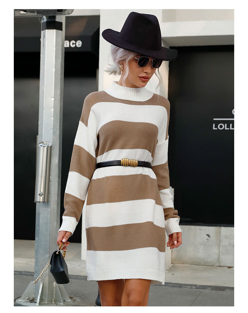 Khaki-gestreifte, langärmlige, lockere Pulloverkleider