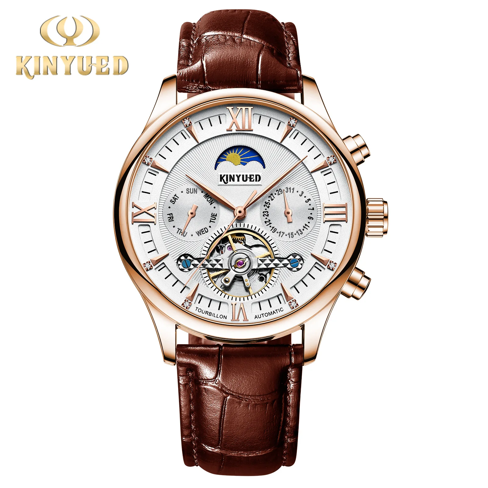 Brand Name : KINYUEDModel Number : 087Feature : tourbillon,Complete Calendar,Moon Phase,Week DisplayOrigin : Mainland ChinaStyle : LuxuryMovement : Automatic Self-WindDisplay Type : NumberlessFeature : water proofCase Material : Stainless SteelBoxes & Cases Material : PaperDial Window Material Type : HardlexDial Diameter : 40 to 44 mmCase Shape : RoundBand Material Type : LeatherBand Width : 20 to 24 mmBand Length : 24cmClasp Type : BuckleWater Resistance Depth : 3BarItem Type : Mechanical WristwatchesDisplay Type : NeedleCase Thickness : 13mmBand type : LeatherHign-concerned Chemical : NoneMovement origin : CN (Origin)