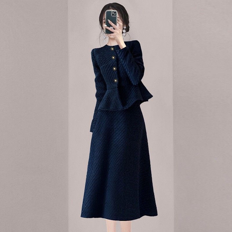 Dress women's woolen fabric 2025 new style for spring, autumn, and winter, with a high-end feel and a small fragrance. Blue waist cinching and slimming two-piece set