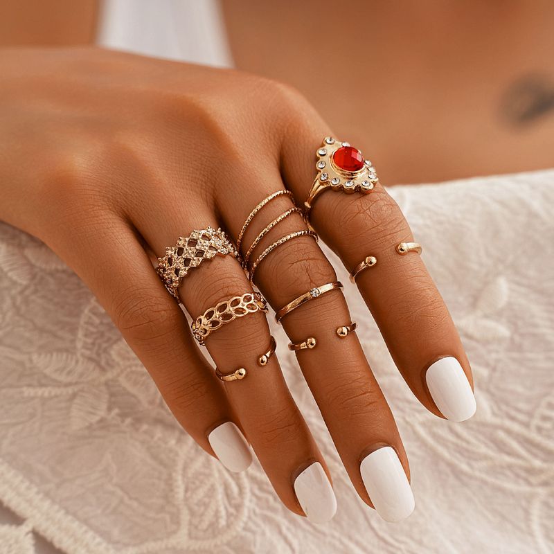 Combination Jewelry Set: Unique Red 10-Piece Gold-Plated Rhinestone Rings
