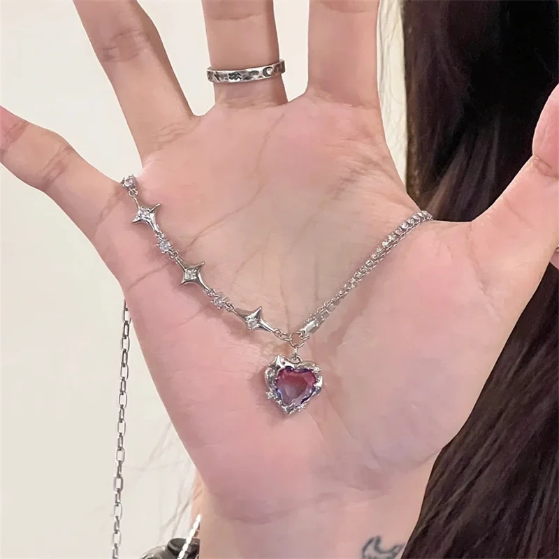 Korean Fashion Lila Kristall Herz Anhänger Halskette für Frauen Schwarz Kristall Egirl Coole Kragen Kette y2k Ästhetischen Schmuck Teil