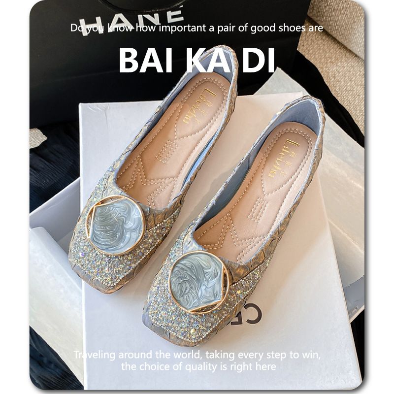 Korean Style Versatile Shallow Mouth Single Shoes for Women Summer Metal Buckle Boat Shoes Rhinestone Slip-On Shoes Large Size Flat Loafers