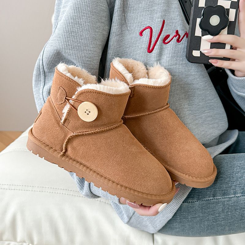 Kurze Schneestiefel aus Rindsleder für Damen, Winter, Fleece-gefüttert, verdickt, warm, niedrig geschnitten, Mom-Button-Baumwollschuhe, rutschfestes Schaffell