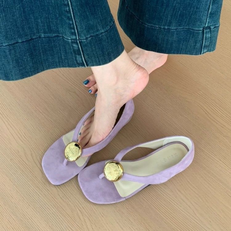 Lancui Version 5cm Versteckter Absatz Metall Runde Schnalle Zehensteg Sandalen Für Frauen 2025 Sommer Neue Silber Hausschuhe
