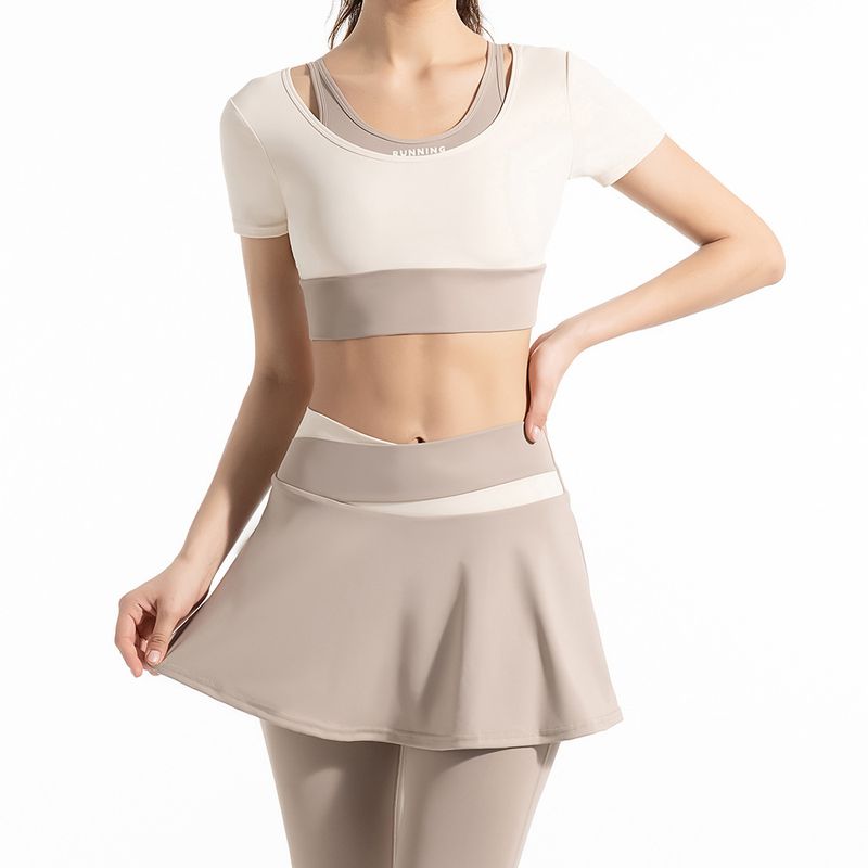 LazyZoom Farbblock, kein BH, schnelltrocknend, zweiteilig, kurzärmlig, Yoga-Oberteil für Damen, hohe Taille, Hüftbedeckung, Anti-Exposure-Fitnessrock