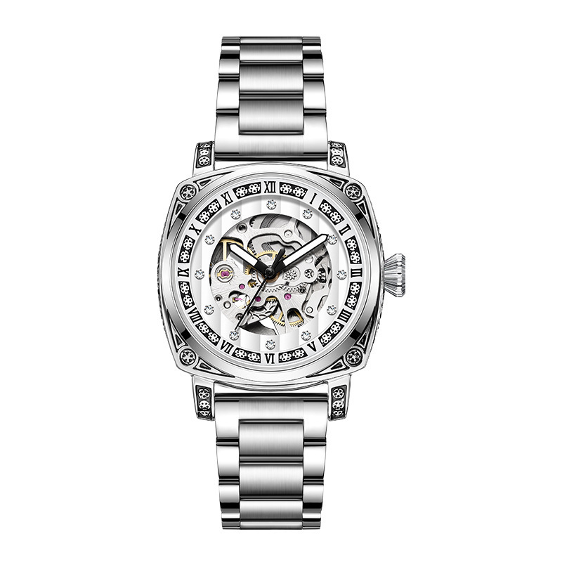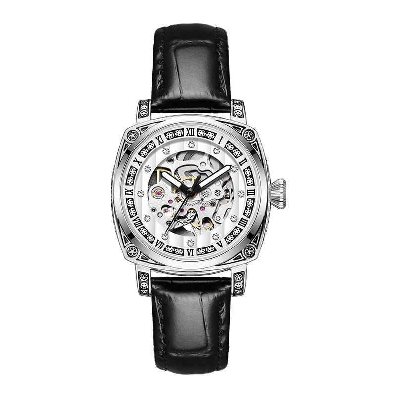 Leichte Luxusnische mit leuchtenden Diamanten, hohle mechanische Damenuhr mit Lederarmband, modische Damenuhr