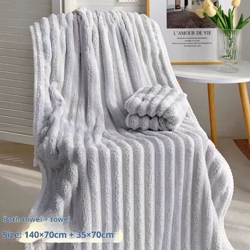 Brand:Jingcheng Textile,Item Number:043,Material:Coral fleece,Gram weight:200g included - 300g not included,Custom Processing:yes,Color:Light yellow, pink, blue, light gray,Specifications Length*Width cm:140*70 bath towel,Cross-Border Source Large Candy Striped Plush:Candy Stripe Towel for Face Washing, Home Use, Absorbent, Quick-Drying, Non-Shedding, 2024 Couple Large Towel, Bath Hand Towel for Men and Women,Yarn Gauge:150D,High-end New Super Absorbent:Coral Fleece Bath Towel Hair Drying Cap Two or Three Piece Set for Women 2024 New Model Wearable and Wrapable for Adults More Absorbent,Candy Bar Coral Fleece Student Towel:Rabbit Fur Plush Blanket Flannel Blanket Nap Blanket Coral Fleece Throw Blanket Air Conditioning Blanket Winter Thickened Fleece Blanket Wholesale,Craftsmanship:Six Weft Wool Weaving, Other,Category:Bath Towel/Sand Beach Towel
