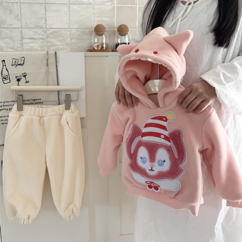 Girls' Set 23 Winter New Thickened Cartoon Hooded Sweater Baby Fashionable Cute Plush Guard Pants Two Piece Set