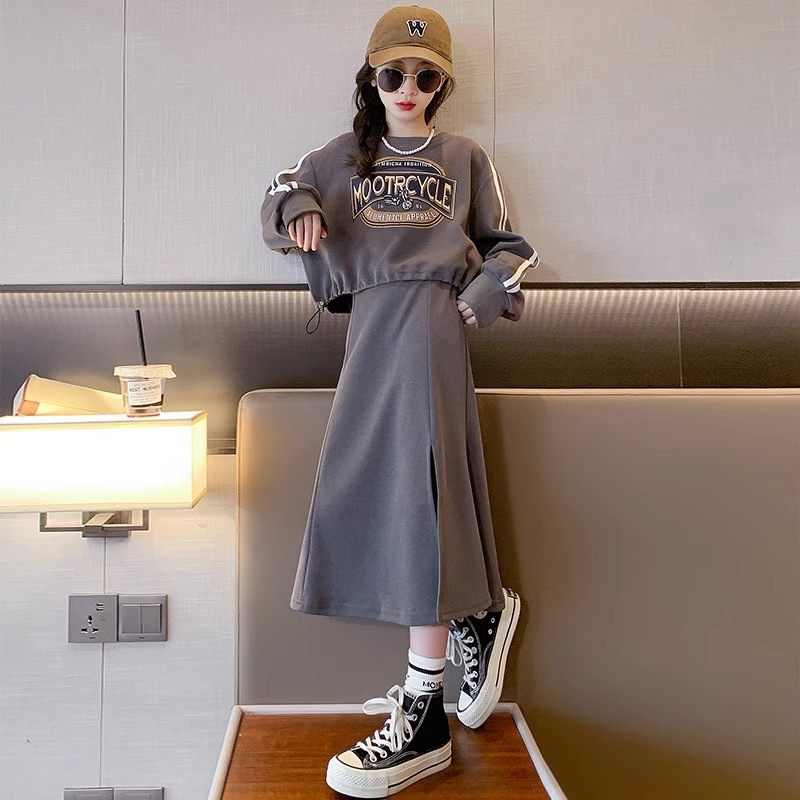 Mädchen Frühling und Herbst neuer langärmeliger Pullover, mittellanger Rock zweiteilig 2023, trendige Damenmode, dünner Stil