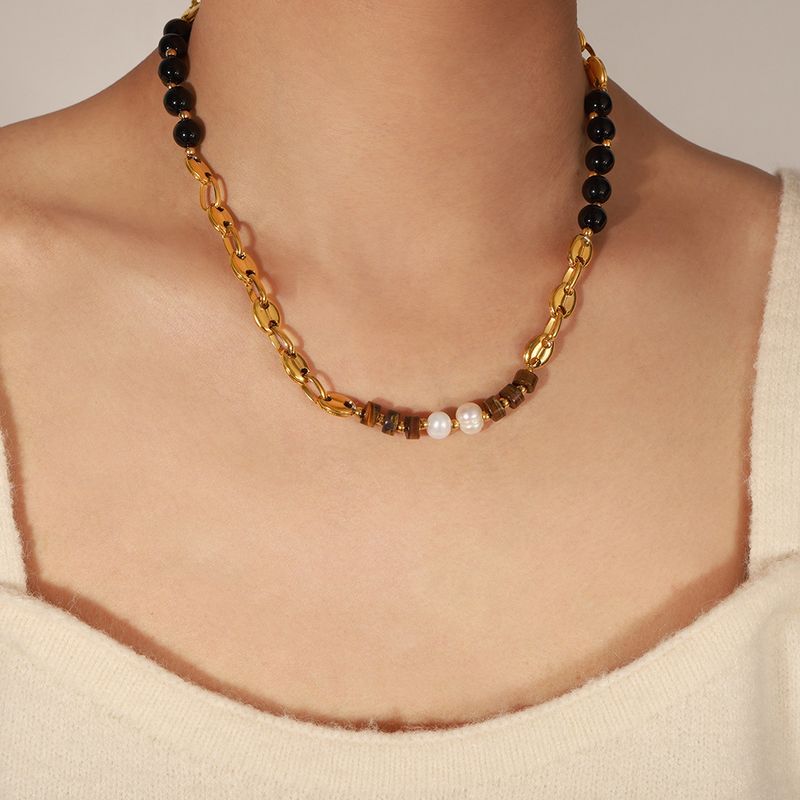 Maillard-Stil Modischer Schmuck aus Titanstahl Tigerauge-Stein Schwarze Achat-Perlenkette Vergoldetes Designgefühl