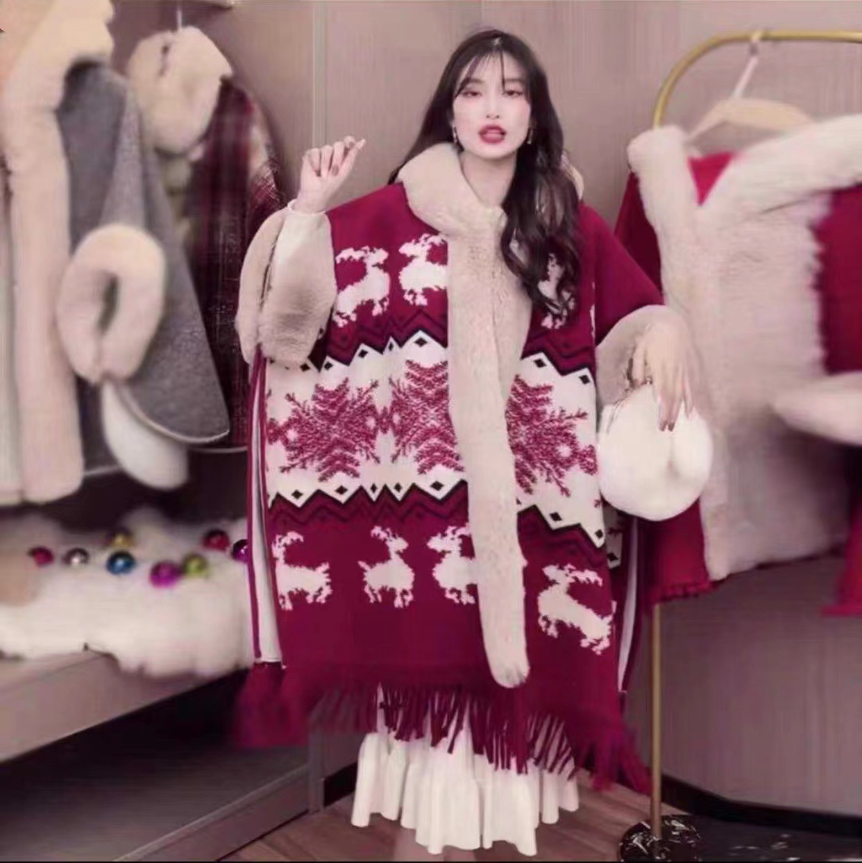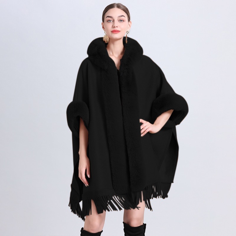 Lockerer und dicker Wollmantel mit Vlieskragen, Kapuze und Fransen, gestrickter Schalumhang in Übergröße