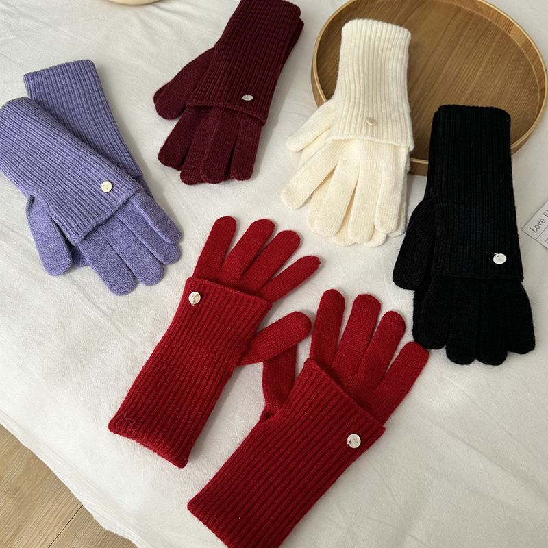 Multiple wearing methods: Solid color knitted gloves for women, winter warmth, knitted yarn, outdoor cycling, student gloves