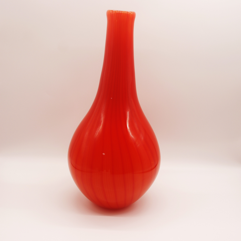 Moderne dekorative Glasvase, leuchtendes Orange, gerippte Tropfenform, Design mit langem Hals