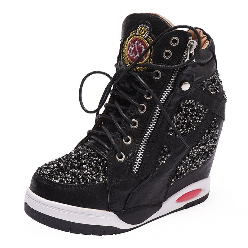 Fashionable Personality Platform Shoes with Hidden Wedge Thick Sole Casual Rhinestone Lace-Up Closed-Toe Shoes for Women