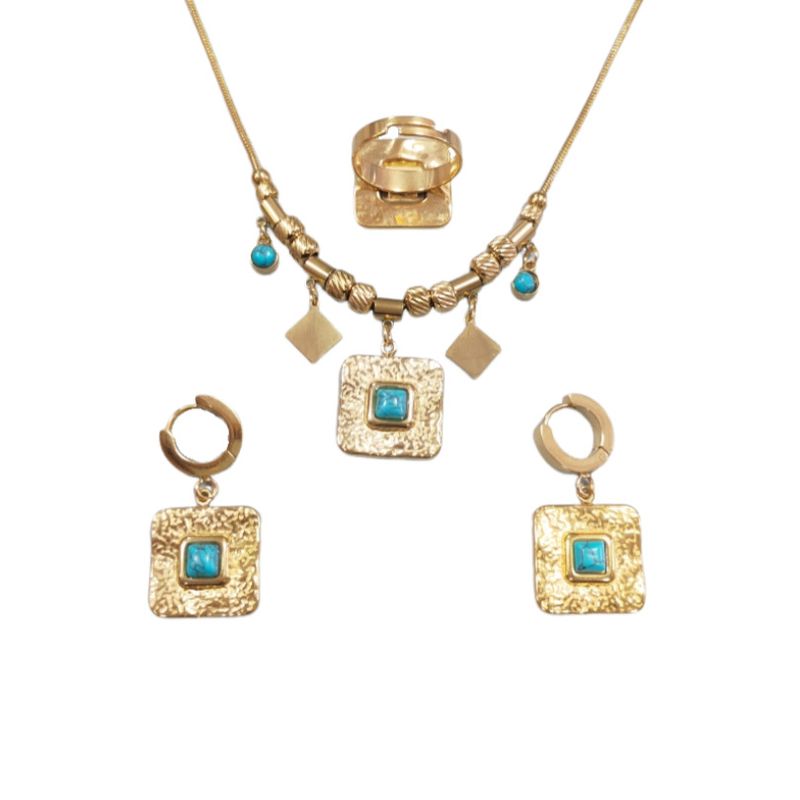 Modisches, dreiteiliges Schmuckset aus Titanstahl mit türkisfarbenem, quadratischem Anhänger