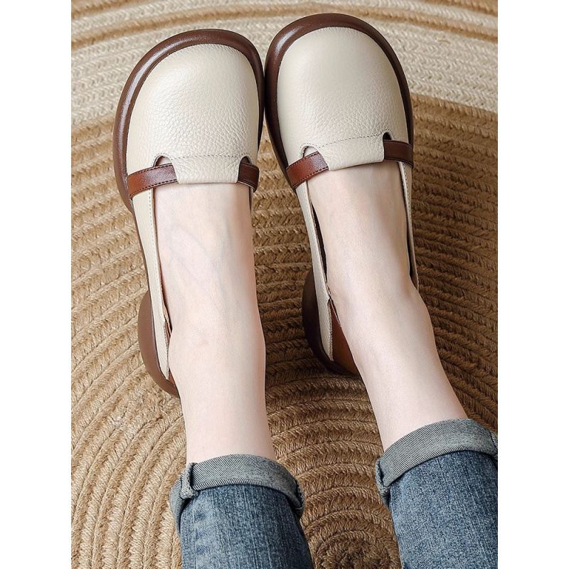 Shallow Round Toe Soft Leather Shoes 2025 New Style Slip-On Soft Sole French Style Women's Shoes Thick Sole Flats