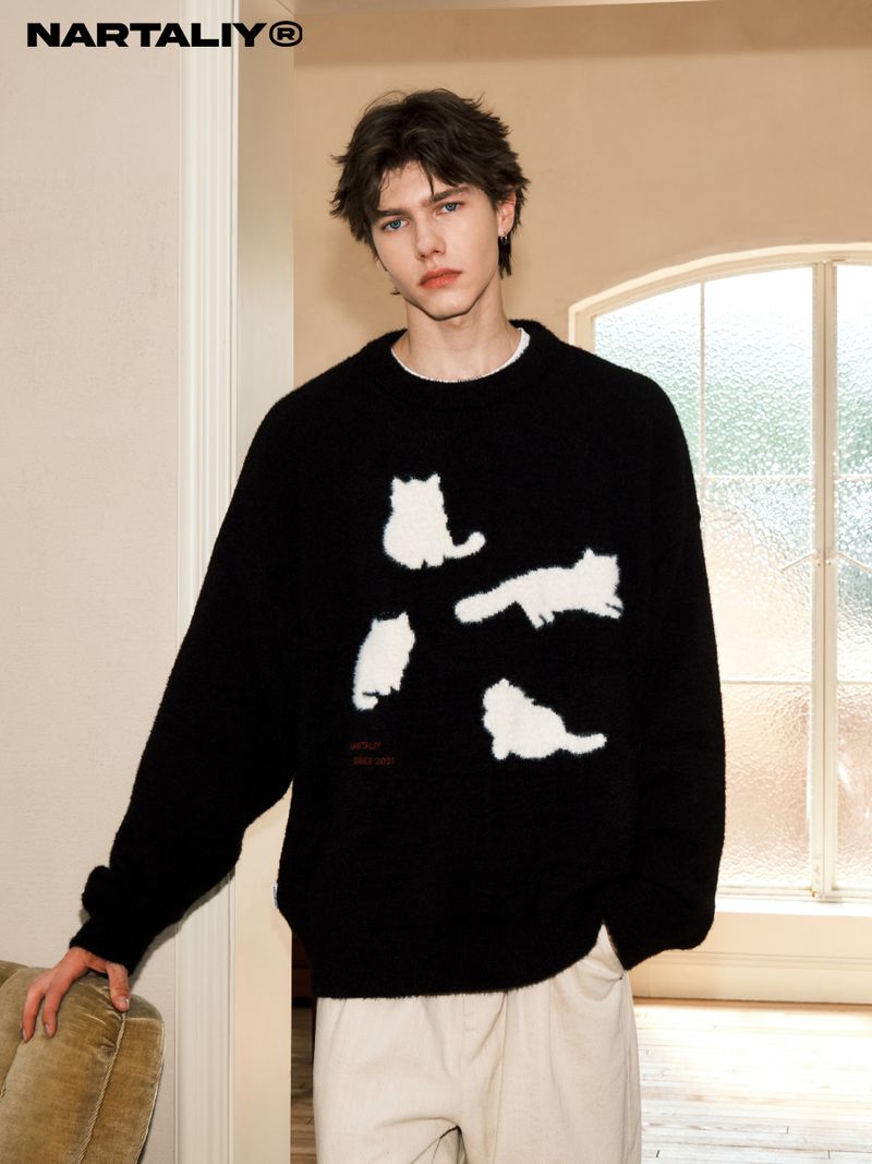 NARTALIY Cat Silhouette Sweater for Men and Women Couples Autumn Winter Trendy American Style Loose Lazy Soft Knitted Sweater