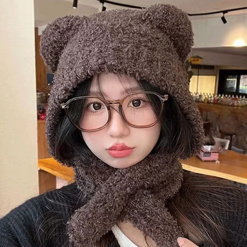New Hat and Scarf Set Two-Piece Plush Bear Winter Warm Knitted Hat for Women Winter Ear Protection Head Wrap Hat