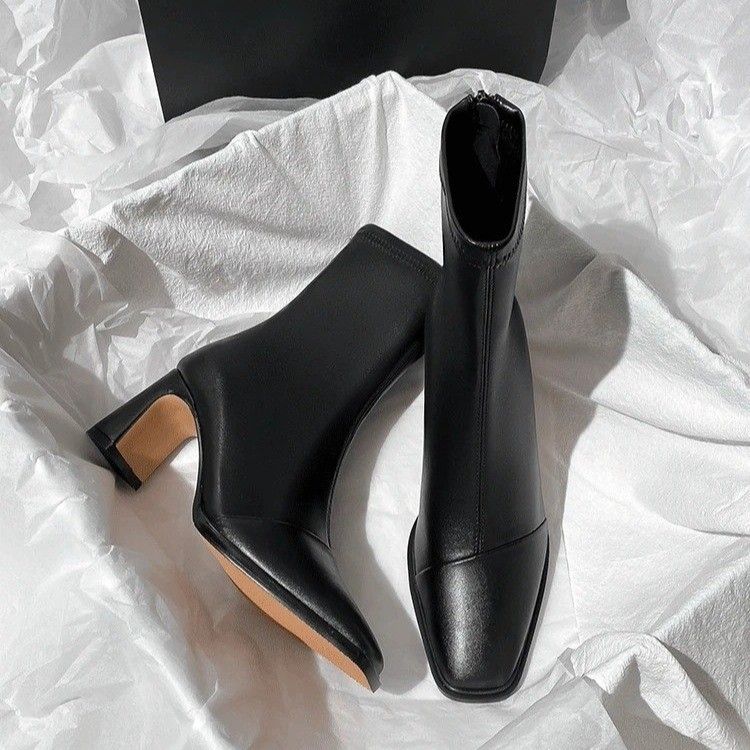 Neue klobige Stiefel im französischen Stil mit quadratischem Stretch-Stiefel und Reißverschluss hinten