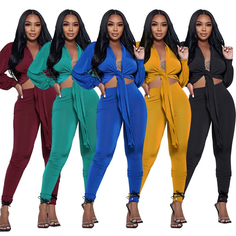 Neues zweiteiliges Damen-Set mit Strickjacke, Krawatte und langen Ärmeln in einfarbiger Farbe und Slim Fit-Hosen
