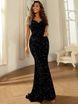 Neues modisches, hüftbetontes, mit Pailletten besetztes europäisches und amerikanisches Kleid mit V-Ausschnitt und langem Abendkleid mit Glockenärmeln und mittlerer Taille