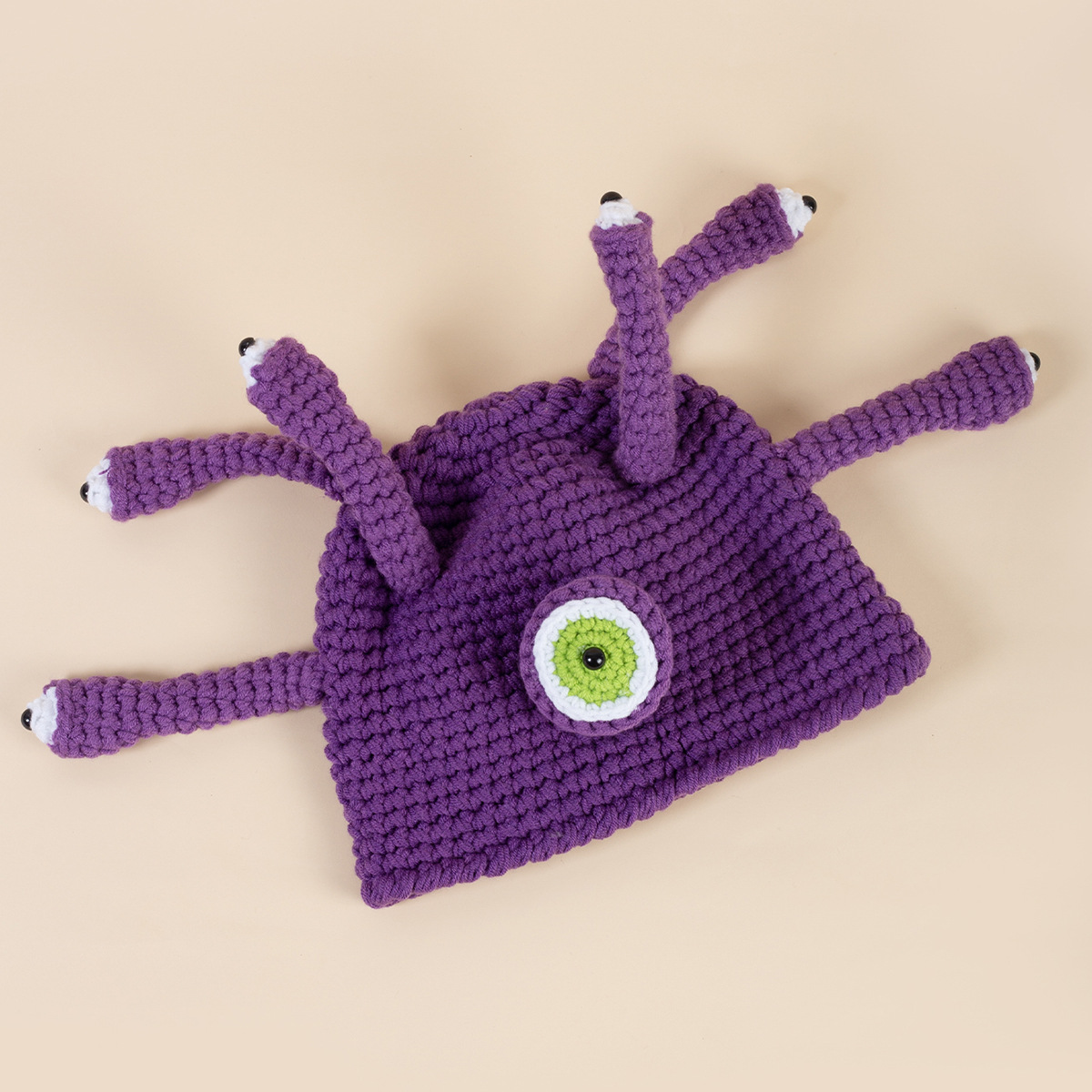Nischen-handgewebte Hüte sind lustig und witzig, lila, kindliche Dekoration mit Wollmützen, Häkelmützen