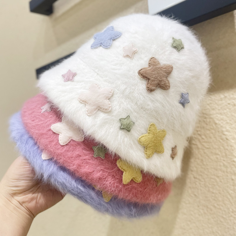 Cute three-dimensional star mink fur fisherman hat for children to keep warm in autumn and winter, fashionable and versatile, showcasing face, small bucket hat