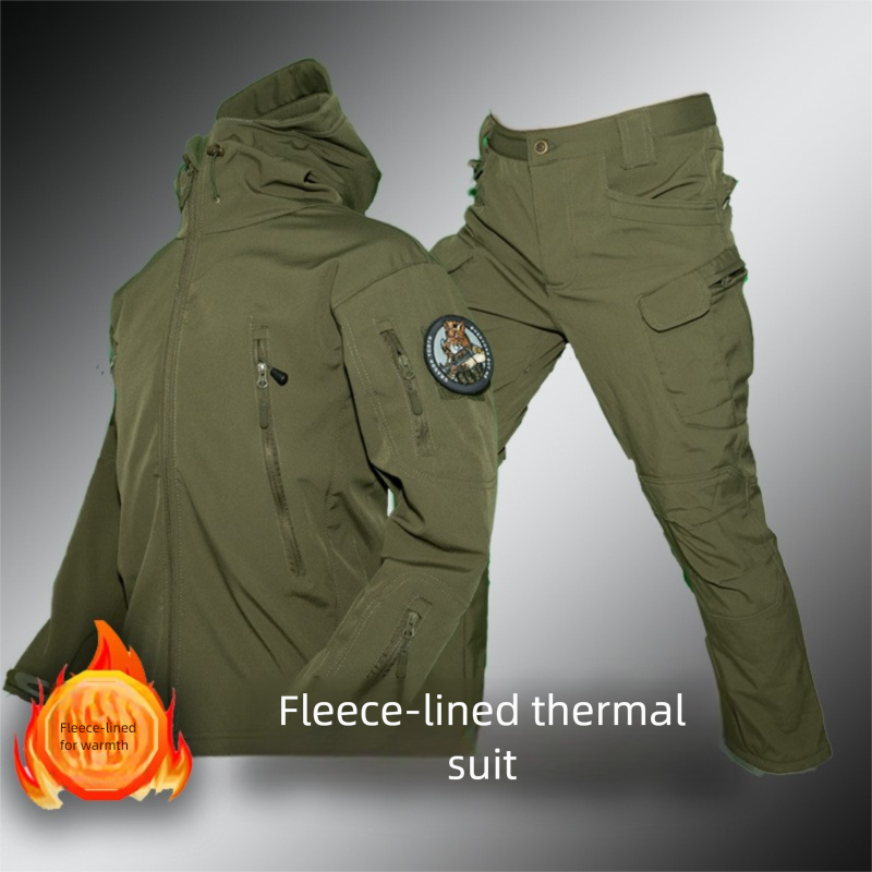 Outdoor Tactical Shark Skin Jacket Set for Men, Fleece-Lined Camouflage Coat, Workwear Hooded Winter Cycling Jacket