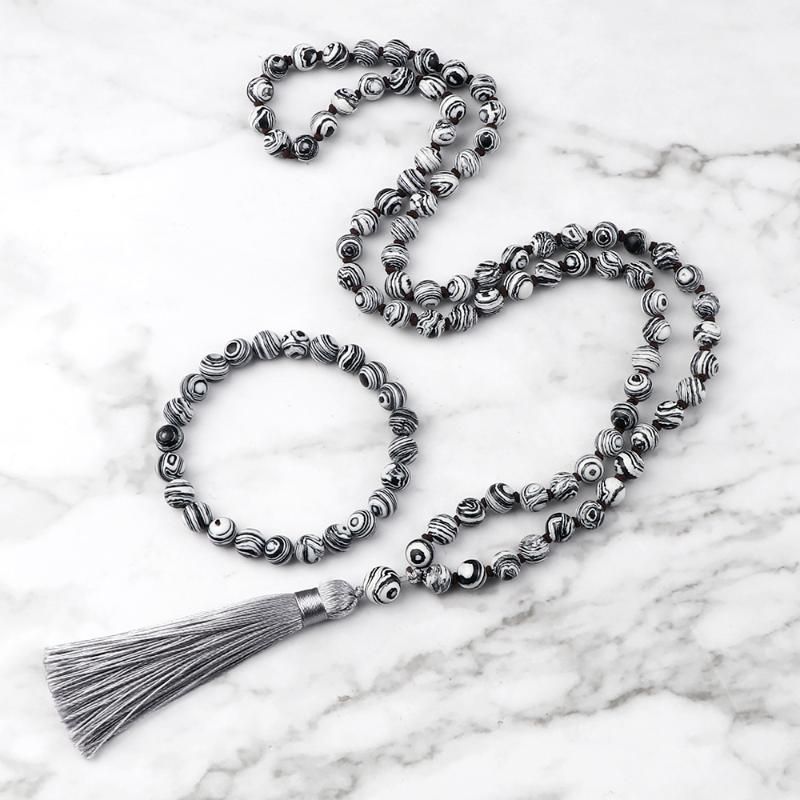 DropshippingFashion Malachite Beaded Necklace 8mm Stone Handmade Knotted Tassel Pendant Jewelry Set Charm Men Bracelet Yoga Rosary Necklaces Gift