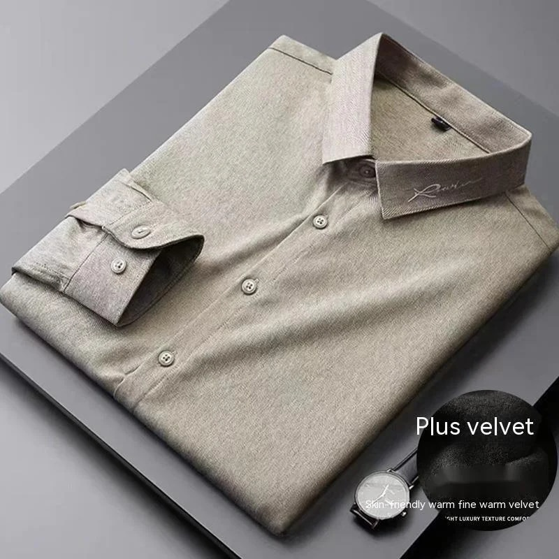 Plush warm long sleeved shirt for men's winter new light business minimalist slim fit embroidered men's shirt