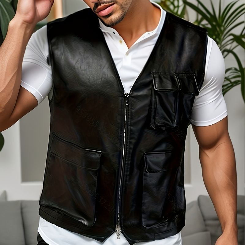 Plus Size Men's New Casual Street Fashion Three-Dimensional Patch Pocket Zipper PU Leather Vest Jacket Loose Slimming