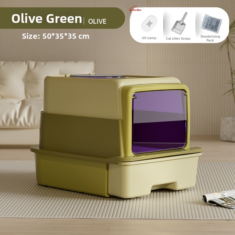 Qinggu Extra Large Olive Dreischicht-Katzentoilette mit Schublade, UV-C-Sterilisation, spritzwassergeschützt, Haustierbedarf